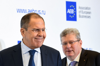 ??? 10月31日,在俄羅斯莫斯科,俄羅斯外交部長拉夫羅夫(左)出席駐俄歐洲企業(yè)協(xié)會成員代表參加的會議。拉夫羅夫當(dāng)日于此表示,俄方希望與歐盟開展更多經(jīng)貿(mào)往來,共同推進(jìn)歐亞一體化進(jìn)程。新華社/法新 |