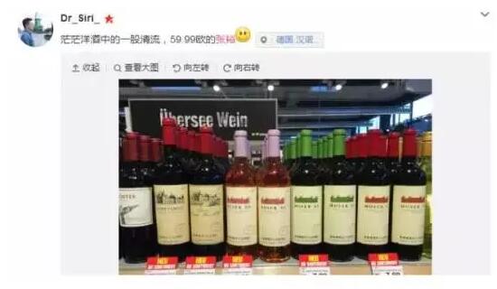 不久前,有位朋友在微博 po 圖稱在德國漢諾威的超市中偶遇張?jiān)F咸丫疲€配文:“茫茫洋酒中的一股清流”。