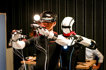 ??? 日本移動通信運營商都科摩通信公司11月8日在日本科學(xué)未來館展示基于5G的應(yīng)用場景。圖為工作人員為觀眾展示遠(yuǎn)程支援機(jī)器人?;?G技術(shù),工作人員的動作可以迅速傳遞到機(jī)器人端,使機(jī)器人做出和工作人員完全一致的動作。記者 馬曹冉 攝 |