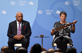 ??? 11月6日,新一輪聯(lián)合國氣候變化會議在德國波恩開幕。面對氣候變化給人類帶來的切實威脅,更加緊密的國際合作、更加切實的減排努力,顯得比以往任何時候都更加迫在眉睫。圖為《聯(lián)合國氣候變化框架公約》第23次締約方大會主席國斐濟(jì)總理姆拜尼馬拉馬(左)與德國環(huán)境部長芭芭拉·亨德里克斯出席大會開幕式。新華社/法新 |
