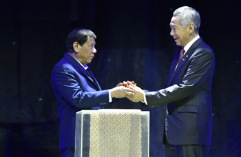 ??? 第31屆東盟峰會(huì)及東亞合作領(lǐng)導(dǎo)人系列會(huì)議11月14日晚間在菲律賓首都馬尼拉閉幕,新加坡將為明年東盟輪值主席國(guó)。圖為菲律賓總統(tǒng)杜特爾特(左)在閉幕儀式上將象征東盟輪值主席國(guó)身份的木槌交給新加坡總理李顯龍。新華社發(fā)(王璽 攝) |