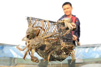 ??? 11月14日,在江蘇省盱眙縣“鮑貢蟹”養(yǎng)殖基地,養(yǎng)殖戶喻剛在捕撈“鮑貢蟹”。近日,江蘇省淮安市盱眙縣培育的特色螃蟹“鮑貢蟹”大批量上市。自2008年以來,盱眙縣依托洪澤湖優(yōu)質(zhì)的水資源,鼓勵(lì)養(yǎng)殖戶和合作社規(guī)模化、品牌化養(yǎng)殖優(yōu)質(zhì)螃蟹?!磅U貢蟹”是當(dāng)?shù)夭扇 巴斗判访缟佟⑺轂轱暳稀钡淖匀火B(yǎng)殖模式養(yǎng)殖而成的特色螃蟹,具有青殼白肚、金爪黃毛、個(gè)體肥大、肉質(zhì)鮮美等特點(diǎn)。目前,盱眙縣“鮑貢蟹”養(yǎng)殖面積已達(dá)5萬畝。新華社發(fā)(周海軍 攝) |