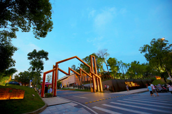 ??? 高聳的煙囪和鋸齒形廠房屋頂,構成了陶溪川文化創(chuàng)意街區(qū)的LOGO。夜晚,燈光將煙囪和屋頂勾勒出優(yōu)美的金色線條,人們遠遠就能認出陶溪川的方位。