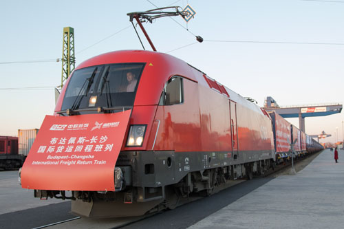 11月27日,布達(dá)佩斯至長沙國際貨運回程班列首發(fā)儀式在匈牙利首都布達(dá)佩斯舉行,這標(biāo)志著布達(dá)佩斯至長沙的中歐班列回程線路正式開通。 新華社發(fā)(弗爾季·奧蒂洛 攝)