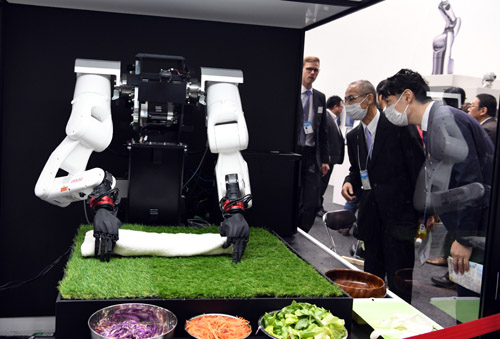 2017國際機器人展覽11月29日在日本東京開幕。圖為機器人表演疊毛巾。記者 馬平 攝