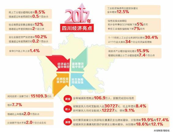 1月19日,省統(tǒng)計(jì)局在成都召開2017年全省經(jīng)濟(jì)形勢新聞發(fā)布會(huì),公布2017年四川經(jīng)濟(jì)運(yùn)行“成績單”:2017年全省經(jīng)濟(jì)總量超過3.6萬億元,GDP同比增長8.1%,增速比全國平均水平高出1.2個(gè)百分點(diǎn)。