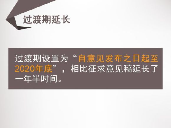 歷經(jīng)五個(gè)多月的征求意見(jiàn)和反復(fù)討論,我國(guó)資管業(yè)務(wù)新規(guī)27日正式發(fā)布。備受關(guān)注的過(guò)渡期問(wèn)題由原來(lái)的2019年6月30日延長(zhǎng)至2020年底,給了金融機(jī)構(gòu)更充足的整改和轉(zhuǎn)型時(shí)間。打破剛兌、禁止資金池、抑制通道,嚴(yán)控風(fēng)險(xiǎn)方向沒(méi)變。