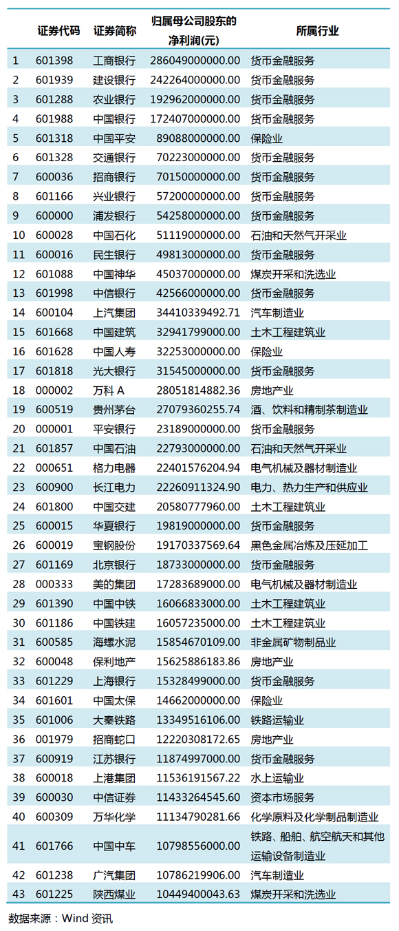 在公布年報(bào)的上市公司中,43家實(shí)現(xiàn)歸屬于上市公司股東凈利潤(rùn)超過100億元,躋身“百億俱樂部”。其中13家歸屬于上市公司股東凈利潤(rùn)超過400億元,這些公司每天都能實(shí)現(xiàn)“賺它1個(gè)億”的“小目標(biāo)”。