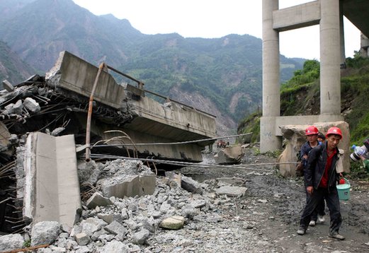 2008年5月14日,老百姓從倒塌的白花大橋旁走過。此次大地震中,震中地區(qū)汶川縣附近的道路受到嚴(yán)重破壞。記者 袁滿 攝