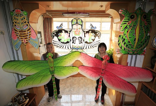 上圖為付憲明和老伴展示自制的風(fēng)箏。