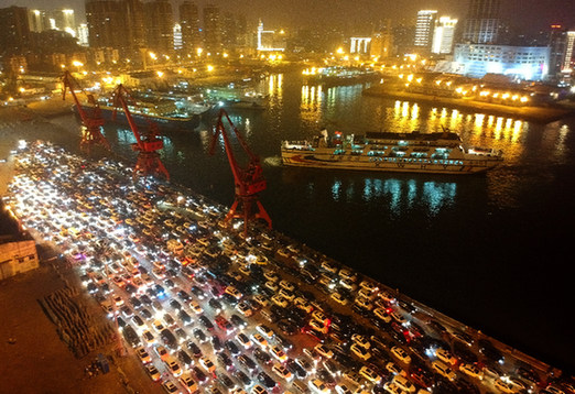 2月21日,在??谑行阌⒏?,大量滯留車(chē)輛等待過(guò)海前往廣東。記者 趙穎全 攝