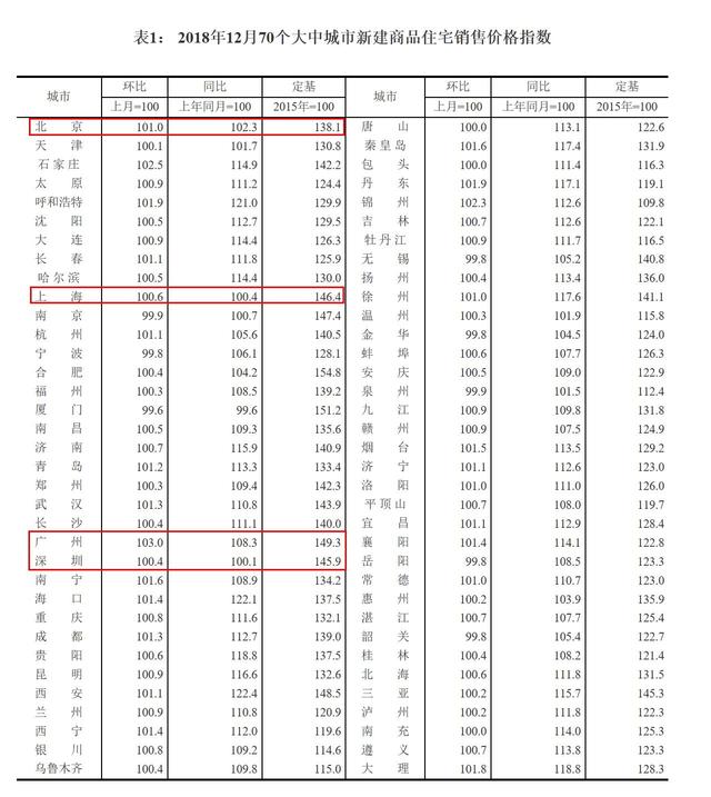 2018年12月份70個大中城市商品住宅銷售價格變動情況。圖片來源:國家統(tǒng)計局網(wǎng)站