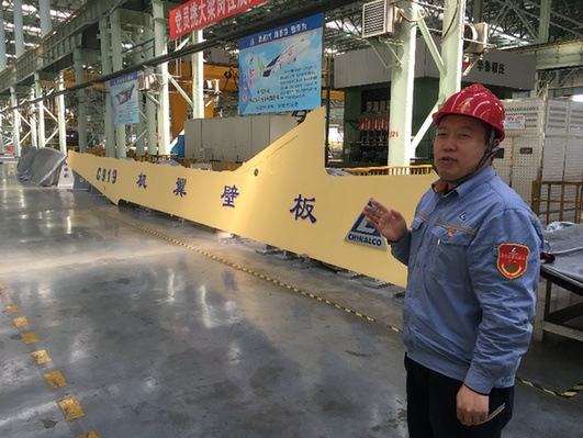 中厚板廠黨總支書記劉海付向記者介紹東輕公司為大飛機(jī)項(xiàng)目配套的機(jī)翼壁板生產(chǎn)情況。記者 王淮志 攝
