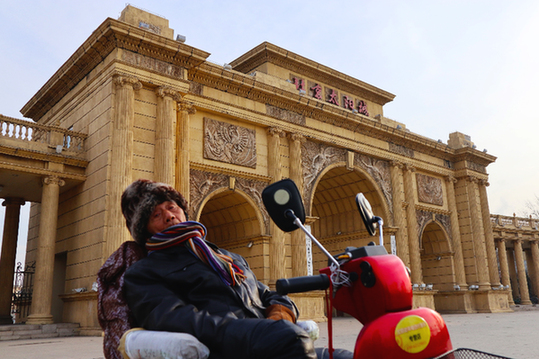 1月18日,在北京太陽(yáng)城國(guó)際養(yǎng)老公寓大門(mén)前的廣場(chǎng)上,一位老人坐在代步車(chē)上曬太陽(yáng)。記者 張小潔 攝