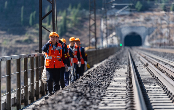 圖為六盤水工電段的橋隧工人在天生橋特大橋橋面進行巡檢。