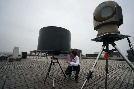科研人員在調(diào)試“蜘蛛網(wǎng)反無(wú)人機(jī)系統(tǒng)”。記者 季春鵬 攝