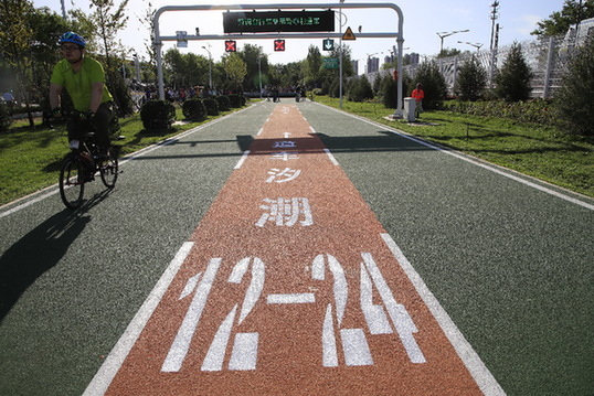 5月31日,北京回龍觀至上地自行車專用路開通,這是北京首條專門服務(wù)于自行車通行的道路,全長(zhǎng)約6.5公里。新華社發(fā)(劉憲國(guó) 攝)