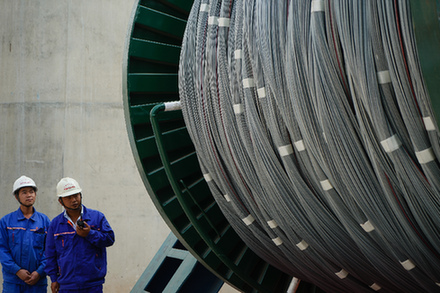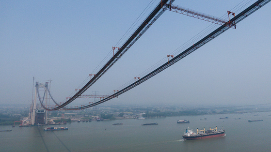 5月10日,中鐵大橋局承建的連(云港)鎮(zhèn)(江)鐵路五峰山長江大橋704根主纜索股全部架設(shè)到位,標志著我國首座公鐵兩用懸索橋主纜架設(shè)完成。記者 李響 攝