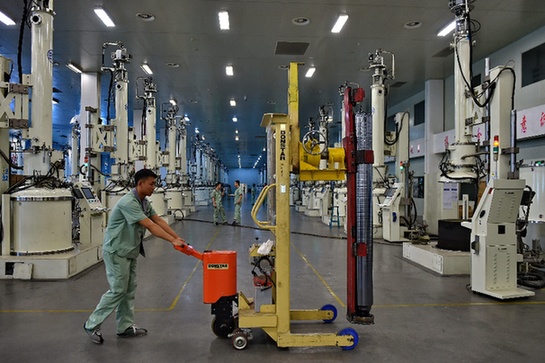 潞安集團(tuán)太陽能科技有限責(zé)任公司的單晶拉制工人在搬運(yùn)剛剛生產(chǎn)的單晶硅棒。記者 曹陽 攝