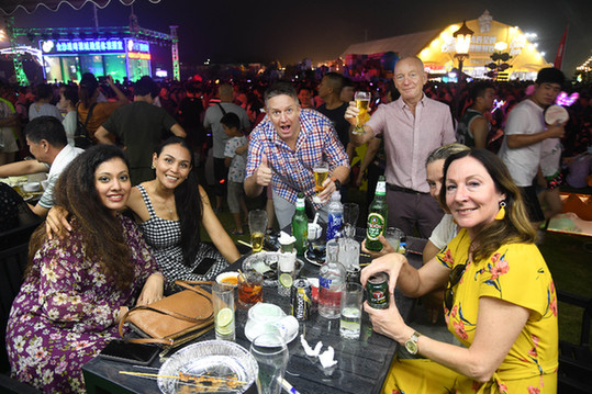 外國(guó)游客在青島西海岸新區(qū)金沙灘啤酒城一啤酒吧體驗(yàn)、消費(fèi)。記者 李紫恒 攝