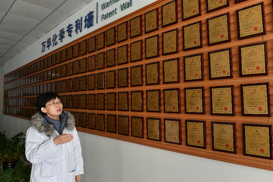 在煙臺(tái)萬華化學(xué)集團(tuán)中央研究院先進(jìn)表面材料中心,萬華員工在專利墻前介紹萬華取得的科技創(chuàng)新成就。資料照片