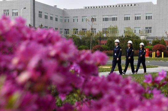 在萬華煙臺(tái)工業(yè)園,工作人員自覺“三人成列”(2019年4月30日攝)。記者 郭緒雷 攝