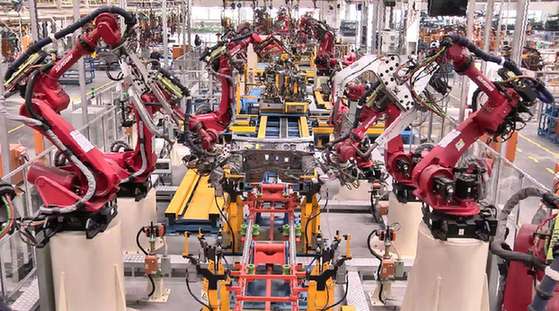 按照寶馬工業(yè)標(biāo)準(zhǔn)設(shè)計(jì)的華晨中華M8X智能化裝焊車間。資料圖片