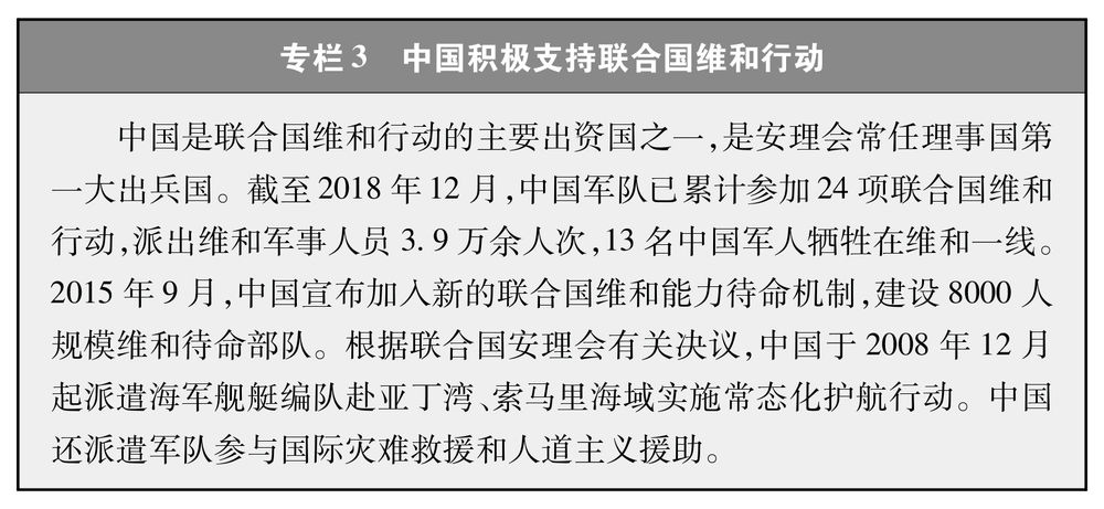中國(guó)以實(shí)際行動(dòng)維護(hù)世界和平。70年來(lái),中國(guó)沒(méi)有主動(dòng)挑起過(guò)任何一場(chǎng)戰(zhàn)爭(zhēng)和沖突,沒(méi)有侵占過(guò)別國(guó)一寸土地。改革開(kāi)放以來(lái),中國(guó)主動(dòng)裁減軍隊(duì)員額400余萬(wàn)。中國(guó)積極參與國(guó)際軍控、裁軍和防擴(kuò)散進(jìn)程,反對(duì)軍備競(jìng)賽,維護(hù)全球戰(zhàn)略平衡與穩(wěn)定。中國(guó)簽署或加入《不擴(kuò)散核武器條約》等20個(gè)多邊軍控、裁軍和防擴(kuò)散條約。中國(guó)已成為聯(lián)合國(guó)第二大維和預(yù)算攤款國(guó)和經(jīng)常性預(yù)算會(huì)費(fèi)國(guó),是安理會(huì)常任理事國(guó)第一大出兵國(guó)(專(zhuān)欄3)。2015年起,中國(guó)宣布設(shè)立為期10年、總額10億美元的中國(guó)-聯(lián)合國(guó)和平與發(fā)展基金,并于2016年正式投入運(yùn)行。中國(guó)始終致力于通過(guò)談判、協(xié)商方式處理領(lǐng)土問(wèn)題和海洋劃界爭(zhēng)端,同14個(gè)鄰國(guó)中的12個(gè)國(guó)家徹底解決了陸地邊界問(wèn)題,劃定了中越北部灣海上界線,為和平解決國(guó)家間歷史遺留問(wèn)題以及國(guó)際爭(zhēng)端開(kāi)辟了嶄新道路。中國(guó)積極參與重大國(guó)際和地區(qū)熱點(diǎn)問(wèn)題解決,發(fā)揮了建設(shè)性作用。