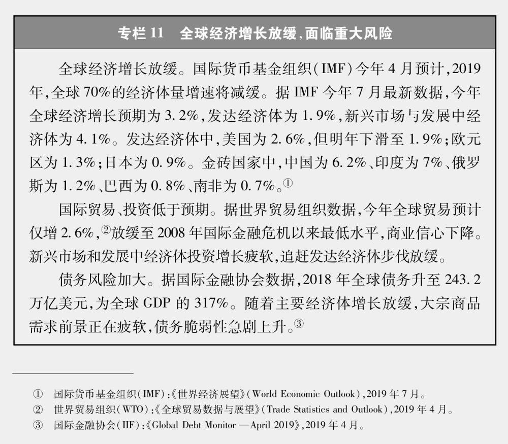 大變局充滿風(fēng)險(xiǎn)和挑戰(zhàn)。大變局深刻復(fù)雜、變亂交織,各種新舊因素、力量、矛盾相互疊加碰撞,大國(guó)關(guān)系、國(guó)際秩序、地區(qū)安全、社會(huì)思潮、全球治理深刻重塑,國(guó)際局勢(shì)不穩(wěn)定性不確定性日益突出,治理赤字、信任赤字、和平赤字、發(fā)展赤字越來(lái)越大,世界面臨重新陷入分裂甚至對(duì)抗的風(fēng)險(xiǎn)。全球經(jīng)濟(jì)增長(zhǎng)動(dòng)能不足、增速放緩,資本過(guò)度逐利導(dǎo)致貧富分化持續(xù)加大,貿(mào)易保護(hù)主義愈演愈烈,全球公共和私人債務(wù)高企,部分新興經(jīng)濟(jì)體出現(xiàn)較大金融動(dòng)蕩,全球經(jīng)濟(jì)下行壓力增大(專(zhuān)欄11)。國(guó)際安全形勢(shì)嚴(yán)峻復(fù)雜,國(guó)際戰(zhàn)略競(jìng)爭(zhēng)日趨激烈,地區(qū)安全局勢(shì)持續(xù)緊張,大規(guī)模殺傷性武器擴(kuò)散、恐怖主義、網(wǎng)絡(luò)攻擊、氣候變化、生物安全、有組織犯罪、重大傳染性疾病等傳統(tǒng)和非傳統(tǒng)安全問(wèn)題相互聯(lián)動(dòng),嚴(yán)重威脅全球和地區(qū)安全。圍堵遏制、對(duì)抗威脅的冷戰(zhàn)思維沉渣泛起,霸權(quán)主義、強(qiáng)權(quán)政治甚囂塵上,叢林法則、零和博弈找到新的土壤,嚴(yán)重侵蝕動(dòng)搖戰(zhàn)后國(guó)際秩序基礎(chǔ)。一些西方國(guó)家治理陷入困境,民粹主義泛濫,逆全球化加劇。國(guó)際軍控和裁軍遭遇挫折,軍備競(jìng)賽趨勢(shì)顯現(xiàn),戰(zhàn)略平衡與穩(wěn)定受到破壞,一些地區(qū)熱點(diǎn)問(wèn)題矛盾持續(xù)激化、對(duì)抗不斷升級(jí),戰(zhàn)爭(zhēng)幽靈若隱若現(xiàn)。信息化智能化迅猛發(fā)展,對(duì)人類(lèi)生命的存在形式、活動(dòng)方式、倫理道德等提出了不可忽視的挑戰(zhàn)。