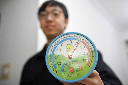 12月4日,長(zhǎng)春市熱力集團(tuán)工人在用溫度計(jì)展示一戶居民家的室溫。
