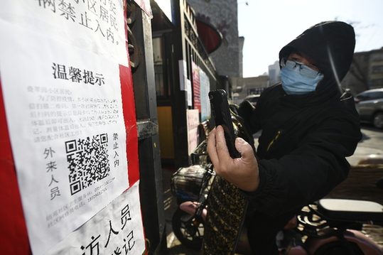 2月5日,寧夏銀川市西夏區(qū)北京西路街道疊翠園小區(qū)住戶通過掃二維碼登記信息。