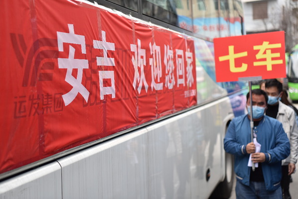 2月26日,在貴州省丹寨縣客車站,外出務(wù)工人員乘坐“返崗專用車”前往浙江省安吉縣。