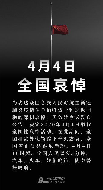 ? 新華社北京4月3日電 為表達(dá)全國(guó)各族人民對(duì)抗擊新冠肺炎疫情斗爭(zhēng)犧牲烈士和逝世同胞的深切哀悼,國(guó)務(wù)院今天發(fā)布公告,決定2020年4月4日舉行全國(guó)性哀悼活動(dòng)。在此期間,全國(guó)和駐外使領(lǐng)館下半旗志哀,全國(guó)停止公共娛樂活動(dòng)。4月4日10時(shí)起,全國(guó)人民默哀3分鐘,汽車、火車、艦船鳴笛,防空警報(bào)鳴響。