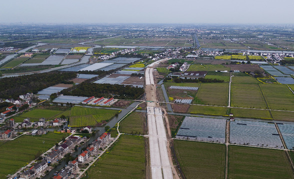 目前,長三角生態(tài)綠色一體化發(fā)展示范區(qū)已全面密集施工?!D為連接上海市金山區(qū)與浙江省嘉善縣的葉新公路-姚楊公路項目施工現(xiàn)場。