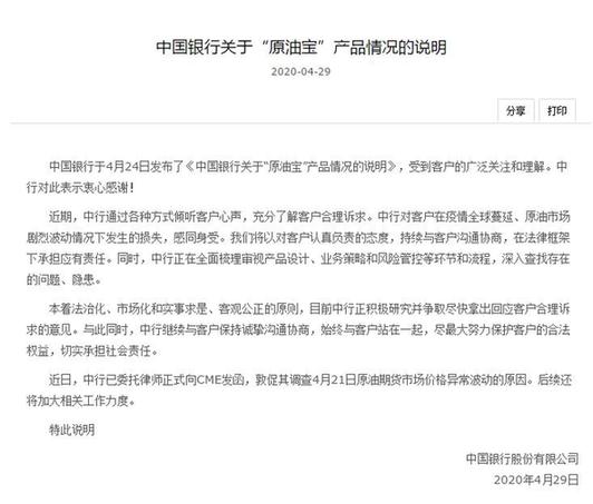 4月24的說明中,中行稱,針對“原油寶”產(chǎn)品掛鉤WTI 5月合約負(fù)結(jié)算價格事宜,中行持續(xù)與市場相關(guān)機(jī)構(gòu)溝通,就4月20日市場異常表現(xiàn)進(jìn)行交涉。而在此次最新發(fā)布的29日說明中,中行明確表示,在近日,中行已委托律師正式向CME發(fā)函,敦促其調(diào)查4月21日原油期貨市場價格異常波動的原因。后續(xù)還將加大相關(guān)工作力度。