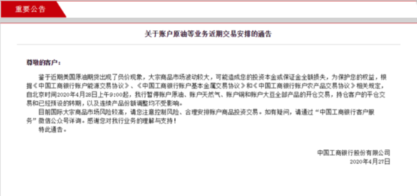 4月27日,中國工商銀行發(fā)布公告稱,為保護(hù)投資者權(quán)益,自北京時間2020年4月28日上午9﹕00起,該行暫停賬戶原油、賬戶天然氣、賬戶銅和賬戶大豆全部產(chǎn)品的開倉交易,持倉客戶的平倉交易和已經(jīng)預(yù)設(shè)的轉(zhuǎn)期,以及連續(xù)產(chǎn)品份額調(diào)整均不受影響。