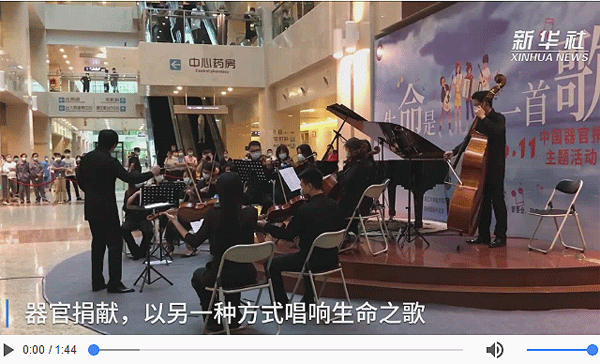 6月11日,由中國(guó)器官移植發(fā)展基金會(huì)發(fā)起的“6.11中國(guó)器官捐獻(xiàn)主題活動(dòng)日”首次采用“云音樂(lè)節(jié)”直播,全國(guó)近50個(gè)城市的10所高校及110家大型醫(yī)院共同參與了線下的公眾宣傳教育活動(dòng)。在浙江大學(xué)醫(yī)學(xué)院附屬第二醫(yī)院門(mén)診大廳,開(kāi)啟了一場(chǎng)特別的交響音樂(lè)會(huì)表演。器官捐獻(xiàn),讓生命的旋律得以延續(xù),以另一種方式唱響生命之歌。