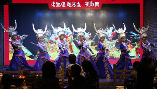 直播當天,主持人鄒遠來到了具有典型苗族建筑風格的老凱俚酸湯魚店。店門前,身穿苗族盛裝的青年男女用熱情古樸的苗族歌舞表演和攔門酒迎接八方客人的到來。主持人鄒遠在丁文建的帶領下,開始了今天的美食文化之旅。