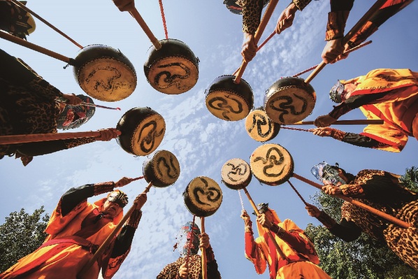 巴象鼓舞是閬中土著巴人由巫舞演化而來的狩獵舞和戰(zhàn)舞,在當?shù)孛耖g代代傳承,至今頑強地保留著巴人的基因——彪悍粗獷、能歌善舞、勇猛尚武……正如古籍所載,“閬中有渝水,賨人居左右,銳氣善舞”“周武王伐紂,實得巴蜀之師……巴師勇銳,歌舞以凌殷人,前徒倒戈。故世稱之曰‘武王伐紂,前歌后舞’也?!?/p>