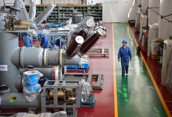 工作人員在中國(guó)西電集團(tuán)西安西電開(kāi)關(guān)電氣有限公司試制車間巡視設(shè)備。記者 邵瑞 攝
