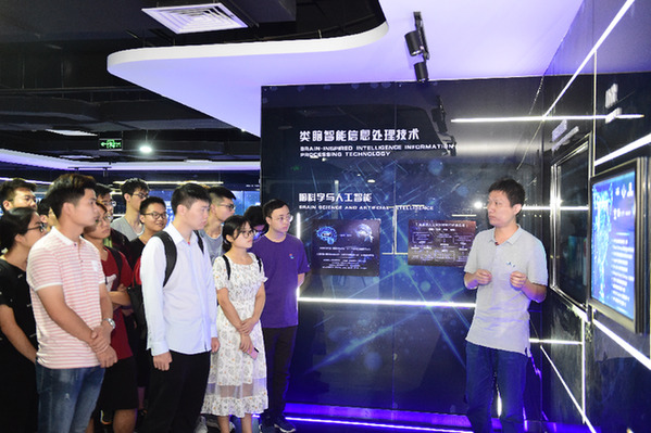 中國(guó)科學(xué)技術(shù)大學(xué)的學(xué)生在類(lèi)腦智能技術(shù)及應(yīng)用國(guó)家工程實(shí)驗(yàn)室展廳內(nèi)參觀。記者 黃博涵 攝