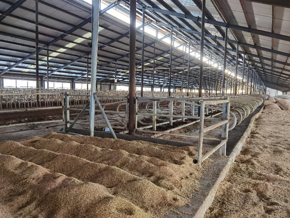 記者走遍全部6棟牛舍,發(fā)現(xiàn)空無一牛,有的牛舍中晾了一些稻谷。偌大的養(yǎng)牛場,只剩更夫一人。更夫介紹,他從2020年春節(jié)后來到這里,就沒看到一頭牛,牛場榨奶廳只安裝了暖氣片,連榨奶設(shè)備都沒有。目前牛場因拖欠建設(shè)資金,已被承建方訴到法院進行了財產(chǎn)保全,牛舍全被查封,他是替保全方看大門的。