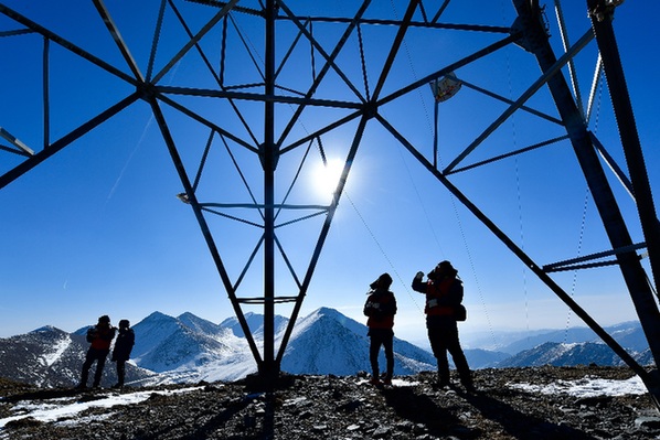 國家電網(wǎng)西寧供電公司輸電運(yùn)檢中心運(yùn)檢人員在查看線路覆冰情況。