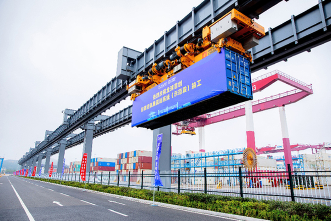 ????今年6月,全球首創(chuàng)智能空中軌道集疏運系統(tǒng)(示范段)在山東港口青島港自動化碼頭竣工投入試運營。資料照片