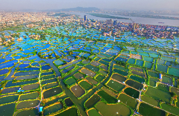 南海九江鎮(zhèn)水網(wǎng)交錯(cuò),高空俯瞰下魚(yú)塘成片,或是村落林立,或是公路貫穿,構(gòu)成一幅幅富有特色的水鄉(xiāng)人家、?;~(yú)塘的田園畫(huà)面。(南海區(qū)委宣傳部供圖)