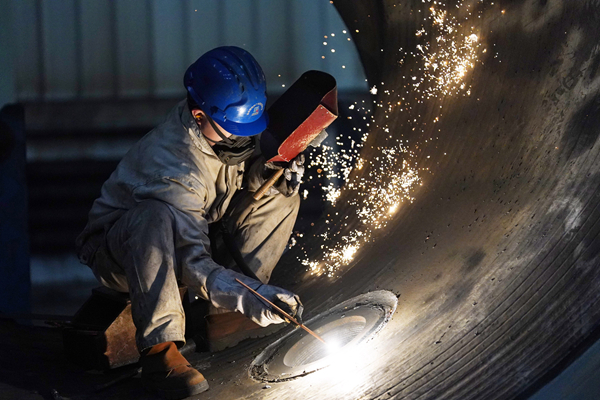 工人在中國一重風(fēng)電裝備生產(chǎn)制造廠車間作業(yè)。記者 王建威 攝