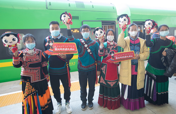 1月10日,在西昌西站,以前趕“慢火車”上學(xué)的喜德縣中小學(xué)生代表在D843次復(fù)興號動車組前留影。