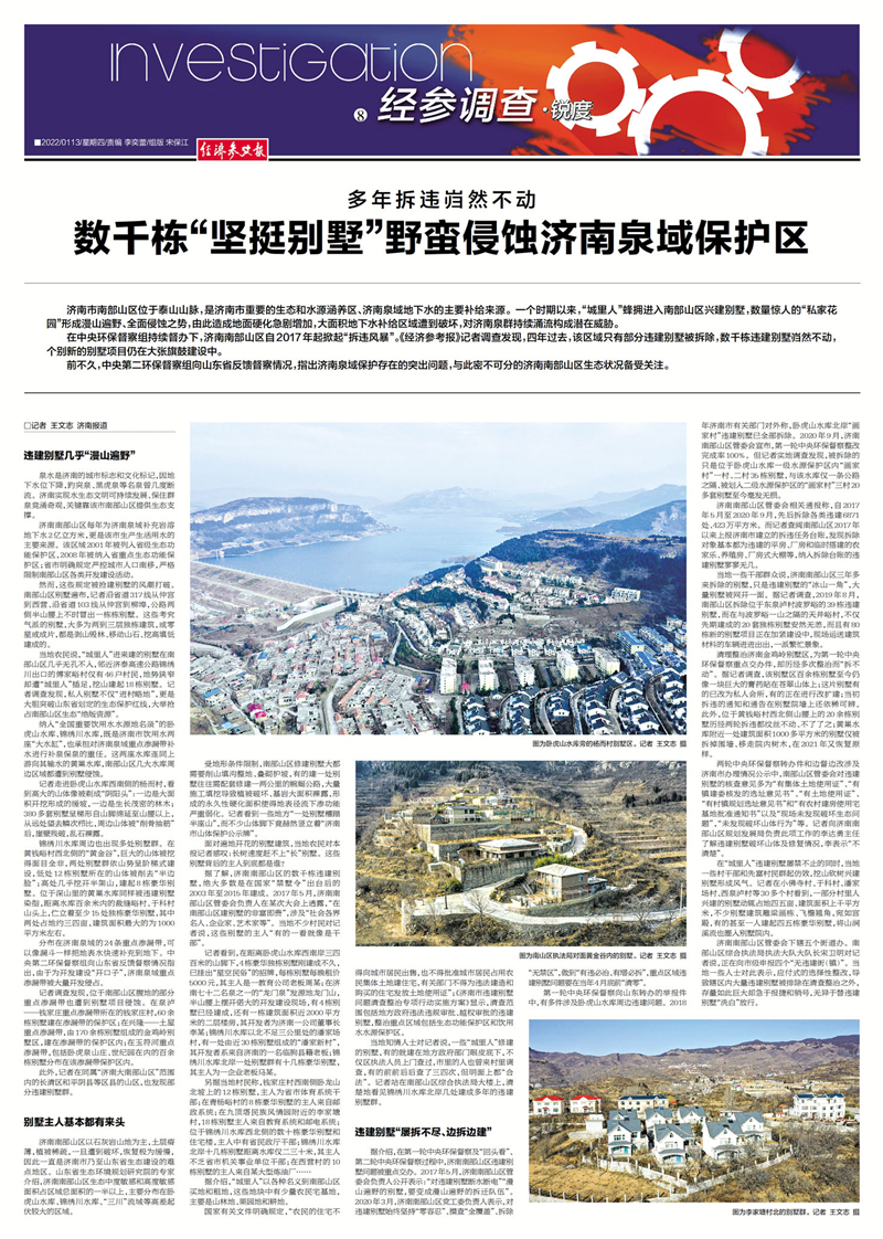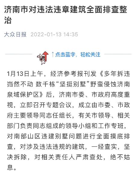 ? 1月13日下午,大眾日報微信公眾號發(fā)布《濟南市對違法違章建筑全面排查整治》一文。文章稱:1月13日上午,經濟參考報刊發(fā)《多年拆違巋然不動 數千棟“堅挺別墅”野蠻侵蝕濟南泉域保護區(qū)》后,濟南市委、市政府高度重視,立即召開專題會議,成立由市委、市政府主要領導同志任組長,有關市領導、相關部門負責同志組成的領導小組和工作專班,對南部山區(qū)違建別墅問題進行全面摸底排查,對涉及違法違規(guī)的建筑,一經查實,堅決拆除,對相關責任人嚴肅查處,絕不姑息。