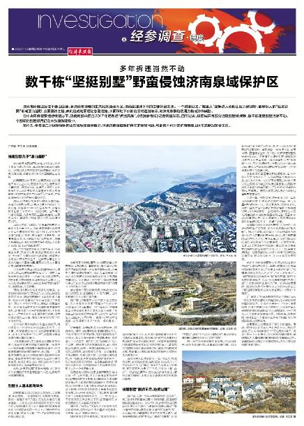 1月13日上午,《經(jīng)濟參考報》刊發(fā)《多年拆違巋然不動,數(shù)千棟“堅挺別墅”野蠻侵蝕濟南泉域保護區(qū)》一文。