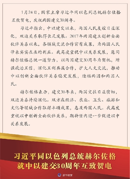 新華社北京1月24日電 1月24日,國家主席習(xí)近平同以色列總統(tǒng)赫爾佐格互致賀電,慶祝兩國建交30周年。